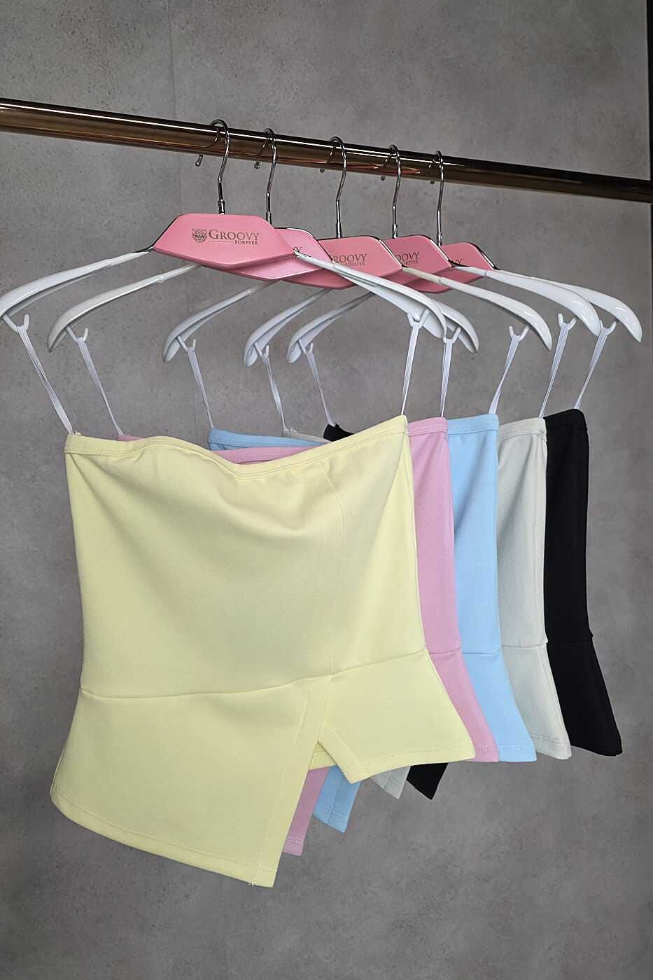 Blusa sem alças com recortes e amarração interna. Confeccionada com tecido canelado leve, com bastante elasticidade e que entrega muito conforto.